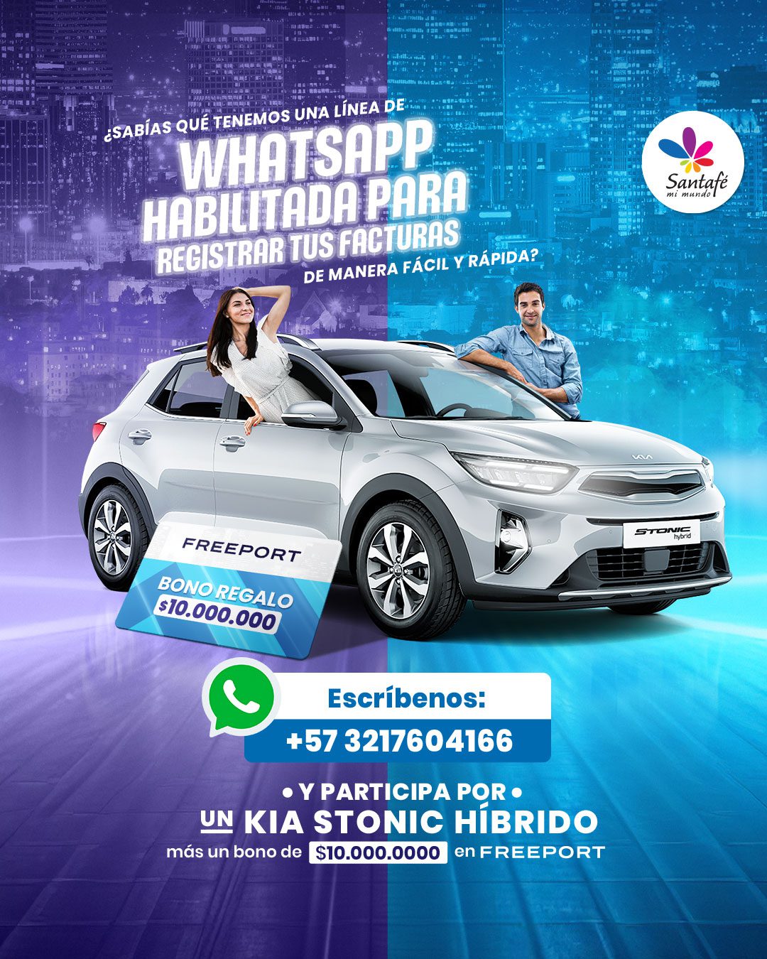 Centro Comercial Santafé Medellín te invita a participar a su concurso en el que podrás ganar un carro Kia Stonic Zenith Híbrido, si quieres participar solamente tienes que registrar en los puntos de información, en la App Santafé Medellín o a través del WhatsApp al 321 760 41 66, tus facturas de compra con fecha desde el 1 de mayo y hasta el 31 de julio de 2024.