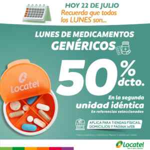 Acabo de ver esta que ahorita está activa la promo Lunes de Medicamentos Genéricos en Locatel, hoy lunes 22 de julio de 2024 podrán disfrutar de un 50% de descuento en la segunda unidad idéntica de tus medicamentos genéricos. Aplica en tiendas físicas Locatel, domicilios y tienda virtual ingresando a www.locatelcolombia.com.