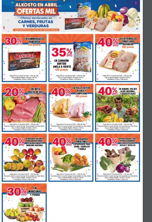 Acabo de ver que Alkosto dio a conocer su nuevo catálogo de ofertas Mil en Mercado, Frutas y Verduras. Las ofertas están vigentes desde el pasado sábado 6 y hasta este siguiente viernes 12 de abril de 2024, acá les comparto el catálogo completo en imágenes para que no se pierdan ninguna de ellas y compren sus productos favoritos a un gran precio.